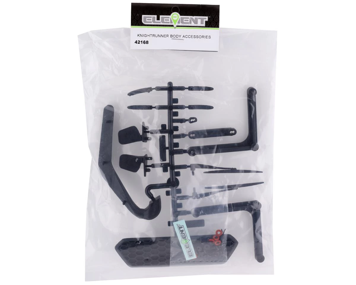 Element RC Knightrunner Body Accessories. These replacement body accessories are intended for the Element RC Enduro Knightrunner. Package includes one parts tree and hardware.