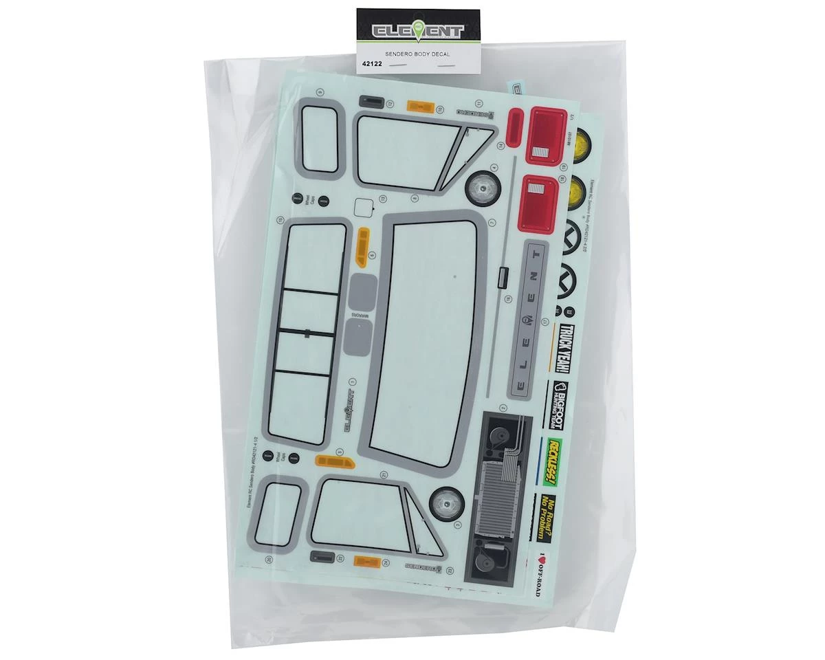 Element RC Sendero Body Decal Sheet. Package includes window, grill and light details, as well as a nice selection of scale stickers that make this sticker sheet a great accessory for any scale truck.