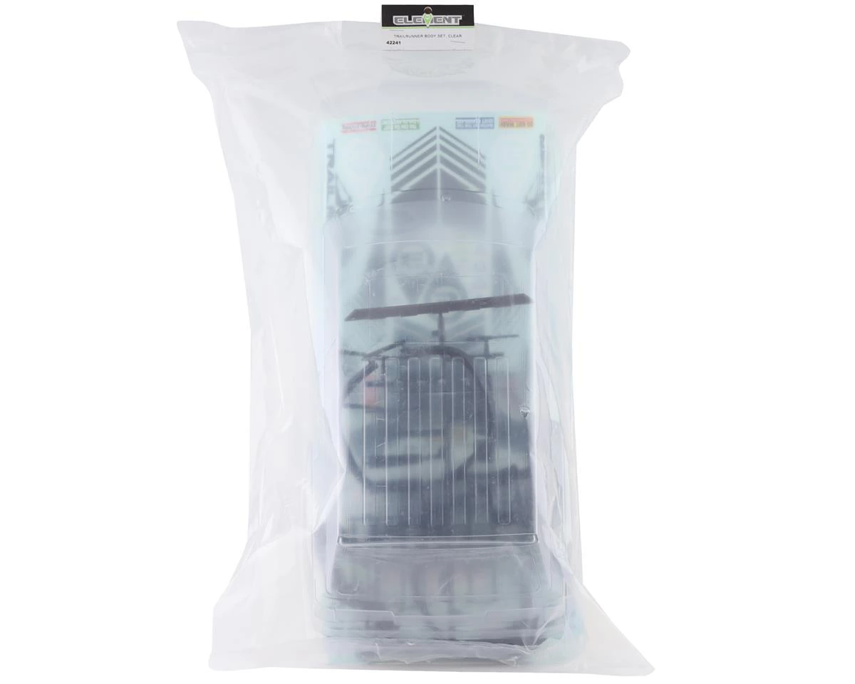 The Element Clear Trailrunner Body Set includes a clear unpainted body, window masks, decals and three trees of body accessories, such as roof rack and windshield wipers; All the parts you need to give this Trailrunner body some style.